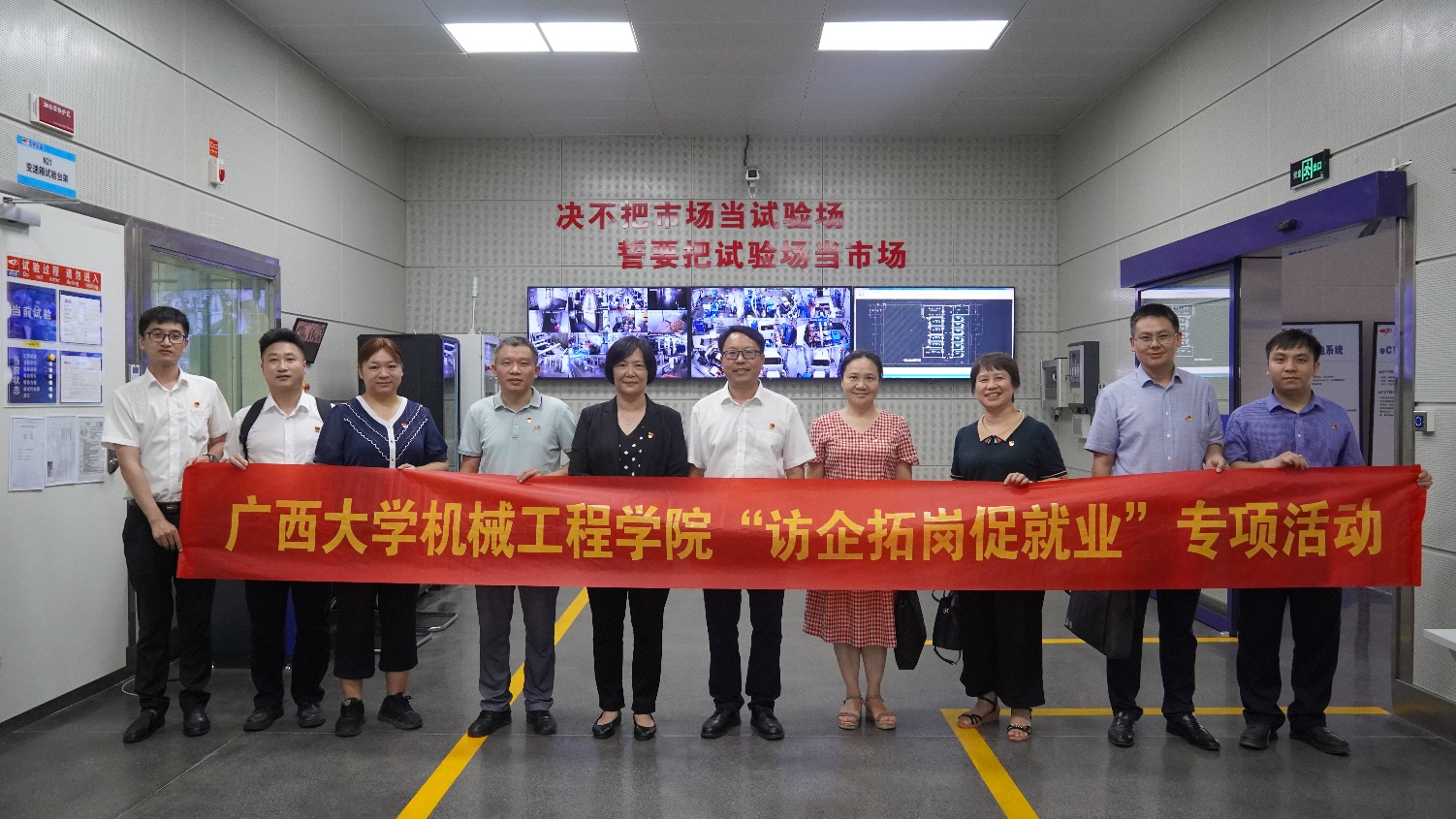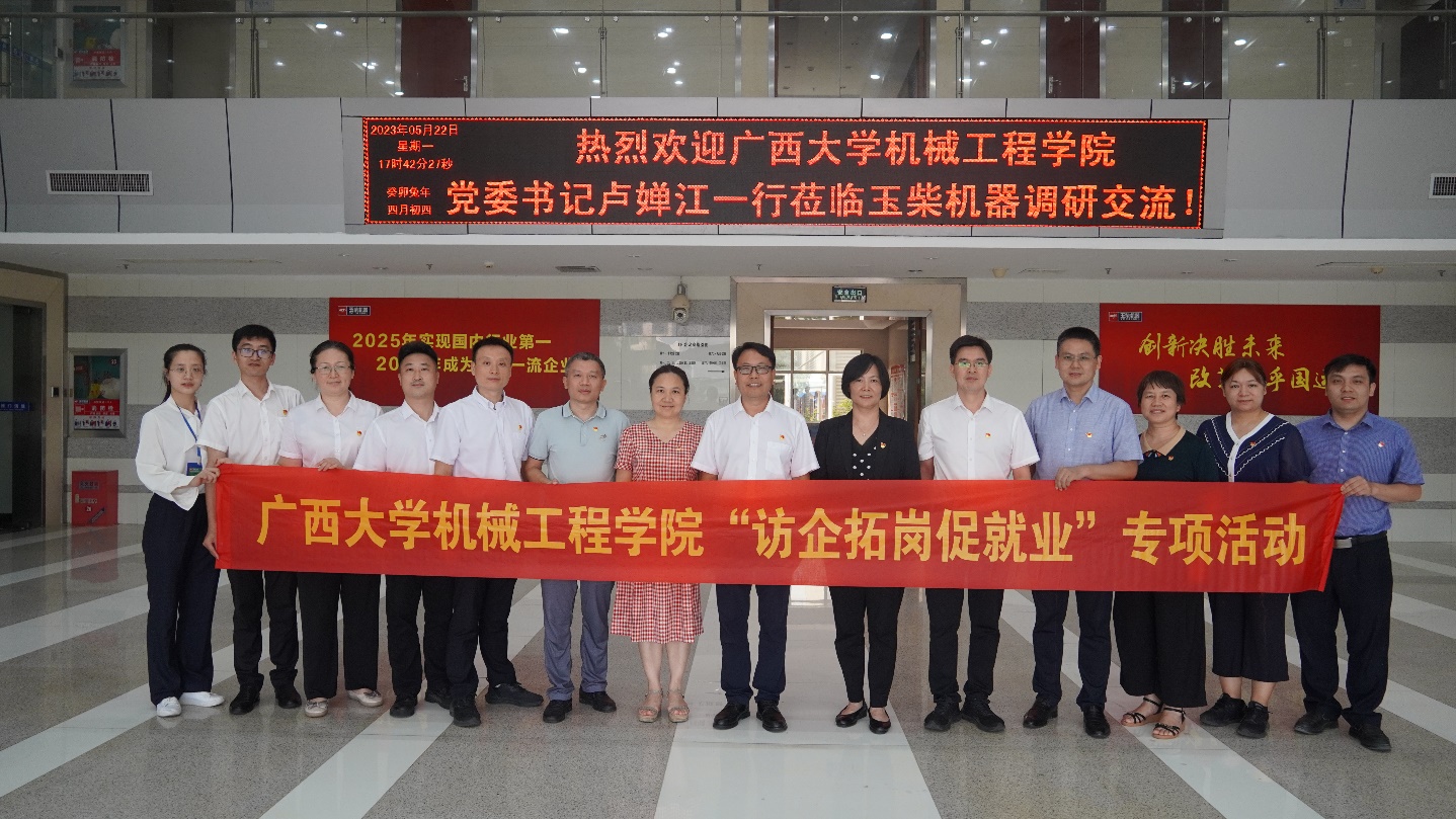 为深入贯彻党中央、国务院关于高校毕业生就业工作的决策部署,推进访企拓岗促就业专项行动,全力促进高校毕业生高质量就业,5月22日,学院党委书记卢婵江、党委副书记黄路明、副院长贺德强、黄豪中、李俚、高欲垚,院长助理兼能源与动力工程系主任欧阳天成一行7人到玉柴机器研发总院走访调研,开展“访企拓岗促就业”专项活动。玉柴机器研发总院党委书记兼常务副院长寇传富,副院长兼新材料与摩擦润滑中心主任覃星念、党委副书记姜博、院长助理兼中重动力平台部主任向本杰、院长助理兼电控与智能化中心主任叶宇、轻动力系统部主任王春玲、运营管理部副主任周益善等参加调研活动。双方一同参观了玉柴机器集团位于南宁高新区的研发基地,详细了解企业的发展历程、生产经营现状、人才结构及关键技术攻关需求等方面的情况。在走访中,学院领导和老师积极向企业推荐beat365官网毕业生,了解企业的人才需求,深度了解企业对毕业生的知识、能力、素质要求,认真分析所在行业的发展趋势和人才需求形势,以作为不断增强人才培养的针对性和适应性的重要参考。