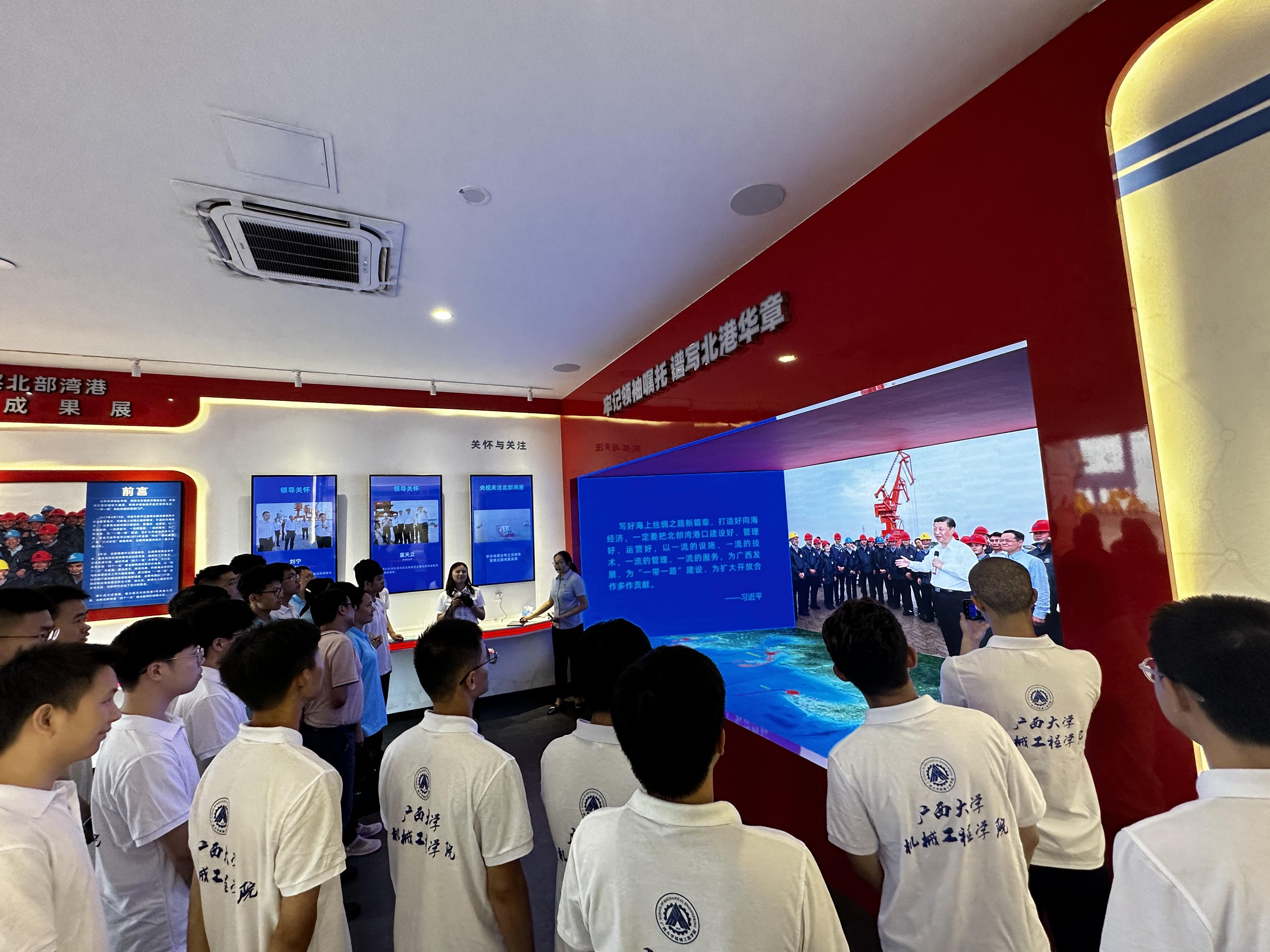 在钦州自动化集装箱码头,工作人员通过巨型沙盘、宣传短片和现场讲解,从无人小车到大型自动化岸桥,从信息系统操控到智能机械维护,让我们直观、全面地了解了我们的第四代码头的科技含量和智慧水平;在汉代文化博物馆,波斯陶壶、罗马玻璃碗、玛瑙串珠……这些来自东南亚、西亚、地中海三问文物,见证了中国古代“海上丝绸之路”的繁荣景象,让师生们了解到了这里曾经是我国最早连接东南亚、南亚、西亚的重要口岸;在北海铁山港,实践团实地参观了港口的货物运输组织、装卸作业过程、设备状况等运作流程,感受到了港口繁忙的作业场景,既增长了见识,又了解了港口青年的工作状态;在玉林博白的龙潭工业园,实践团参观了华创新材铜箔有限公司、广西华友钴业有限公司,参观了新材料生产流水线、基地员工综合中心等,对新材料、新能源产业的发展以及新兴产业员工的生活状态有了更加直观的了解。这些现场参观,让实践团成员更加直观形象地了解了广西地方产业的发展取得的巨大成就,感受到了既有历史文化底蕴、又有现代化创新氛围的广西呈现出的蓬勃之势。实践团还在参观期间与参访单位的校友代表开展了座谈交流;同时,注重发挥优势,与企业员工一起开展理论宣讲和学习,团中央青年讲师团讲师、广西青年讲师团金牌讲师、学院团委书记程锐同志以“使命”为主题宣讲了党的二十大精神和团的十九大精神;此外,实践团还利用参观间隙开展了集中研讨。