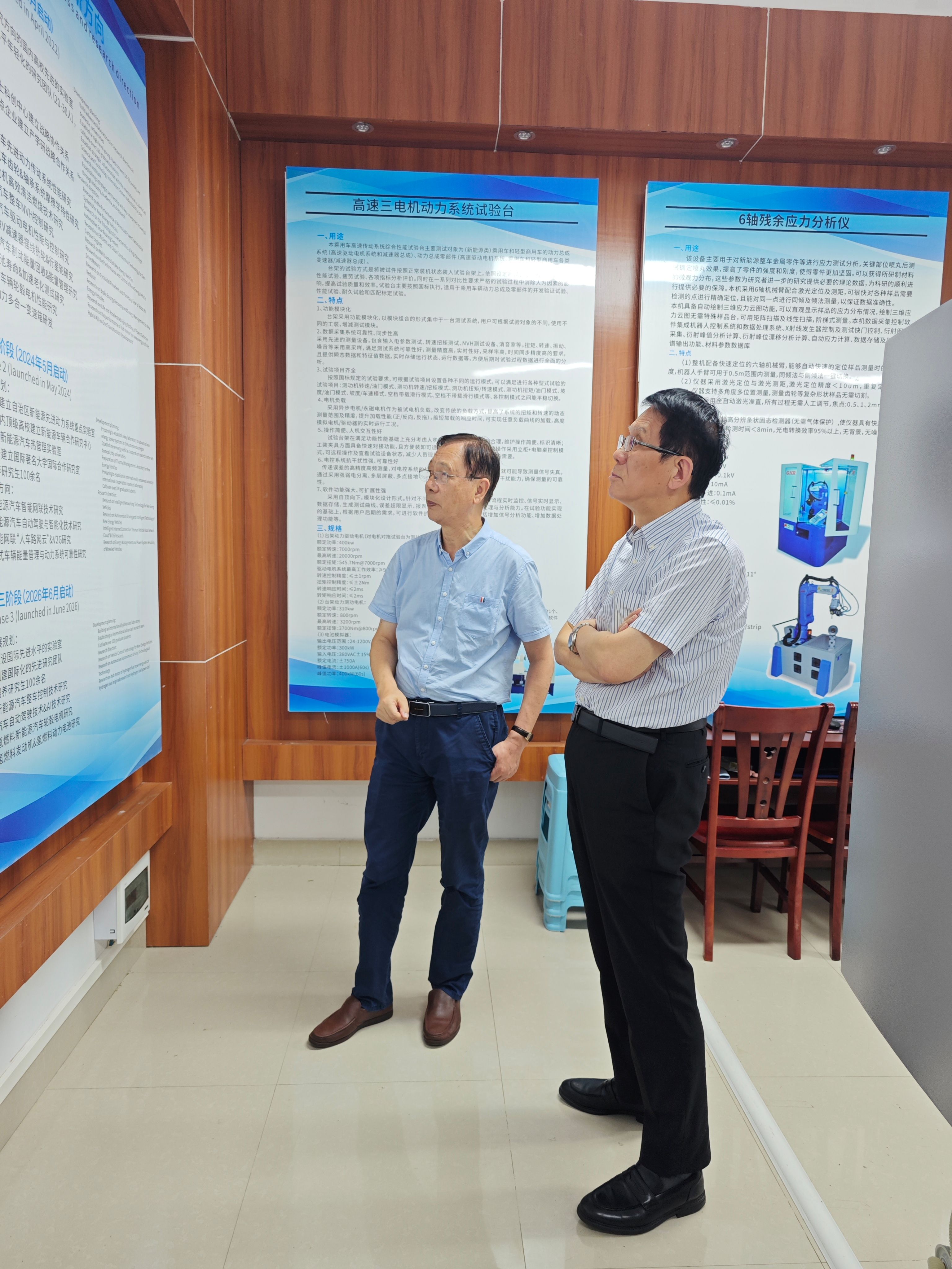 交流会后,巨东英教授参观了新能源汽车研究中心的实验室和各项科研设施,详细了解研究中心在新能源汽车技术领域的最新研究成果和发展方向,并对中心未来的发展规划提出宝贵意见。双方表示未来在更多科技领域开展深入合作,推动广西地区新能源汽车技术的研发与应用。