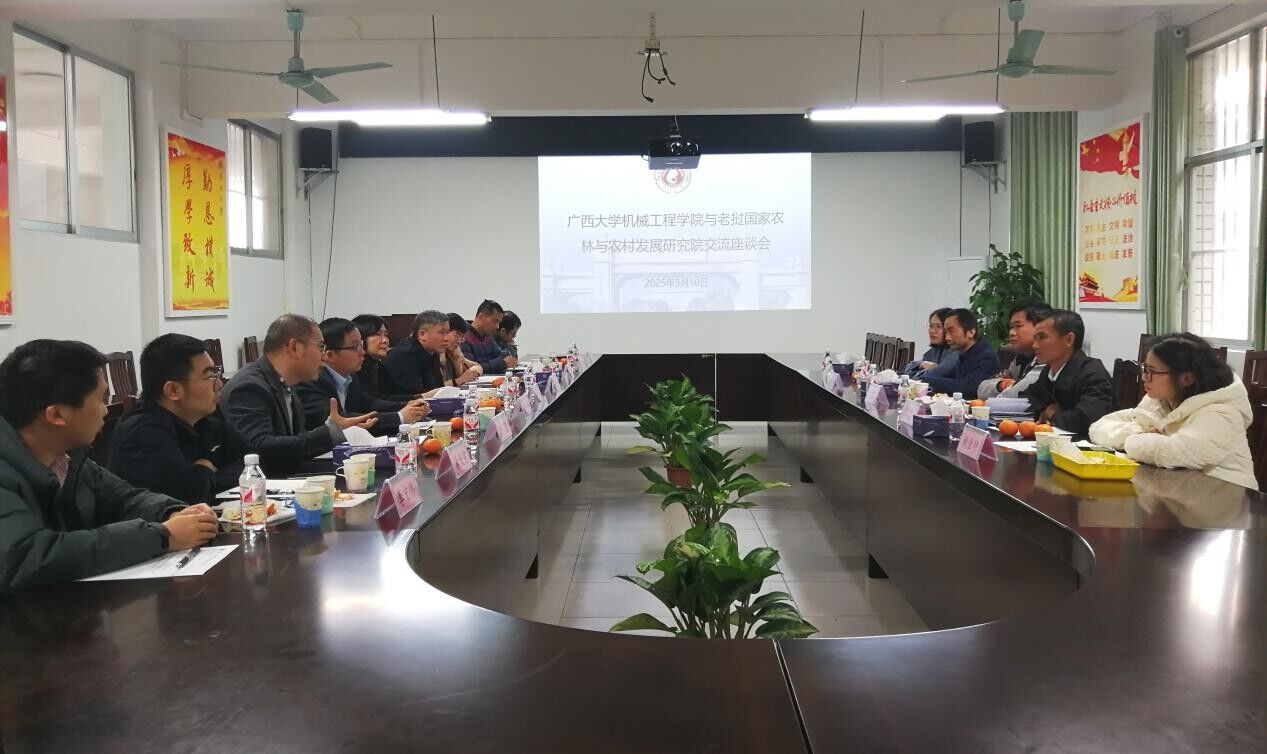 老挝国家农林研究院园艺研究所副所长Bounpheng Sihomchanh先生、中国-老挝合作农作物优良品种试验站副站长兼老挝国家农林与农村发展研究院水果与蔬菜研究中心副处长Bounsavath Phongdara先生,南宁国际商会副会长冼宜艺,中国─马来西亚蓝德环境科技集团股份有限公司副总经理冯石平等一行5人,与beat365官网党委书记卢婵江、副院长黄豪中、莫帅,农机专家团队蒙艳玫、杨望教授等在会上交流,深化中国与老挝在农林机械领域的交流与合作,共同探索适应老挝农业发展需求的农机技术与推广路径。