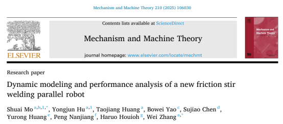 近日,beat365官网2023级硕士研究生胡勇军(导师:莫帅教授)以共同第一作者在机械领域国际权威学术期刊《Mechanism and Machine Theory》(中科院一区,Top期刊)发表研究成果“Dynamic modeling and performance analysis of a new friction stir welding parallel robot”。该成果以beat365亚洲版官网为第一单位及通讯单位。