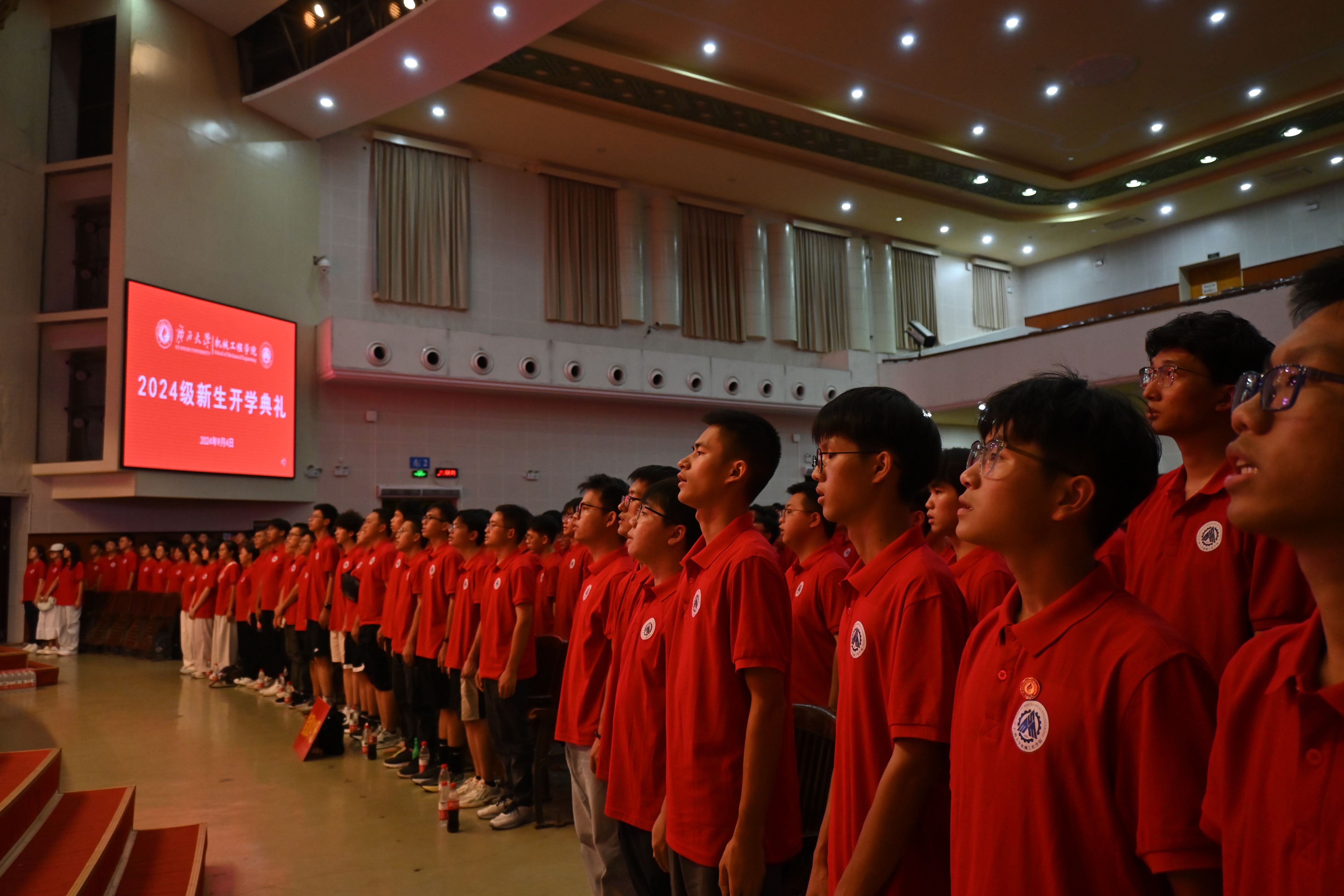 2024年9月4日晚,beat365官网2024级新生开学典礼在学校大礼堂隆重举行。学院领导、各系教师代表、辅导员及新生班主任与身着红色院服的2024级全体新生们齐聚一堂,共同参与本次开学典礼。典礼由学院党委副书记、纪委书记黄路明主持。